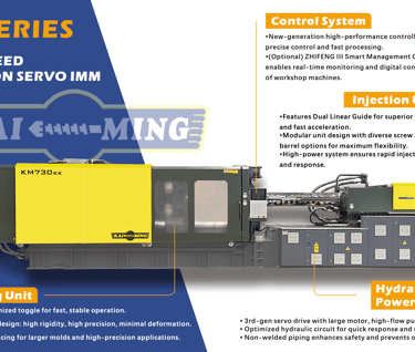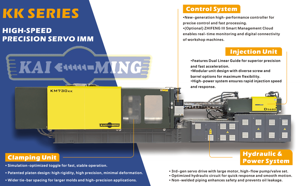 The KK Series High-Speed Precision Servo Injection Molding Machine (100Ton - 3688Ton) represents a high-performance servo injection molding machine built on a new platform, guided by a design philosophy of modularity, easy maintenance, energy efficiency, durability, high speed, and precision.